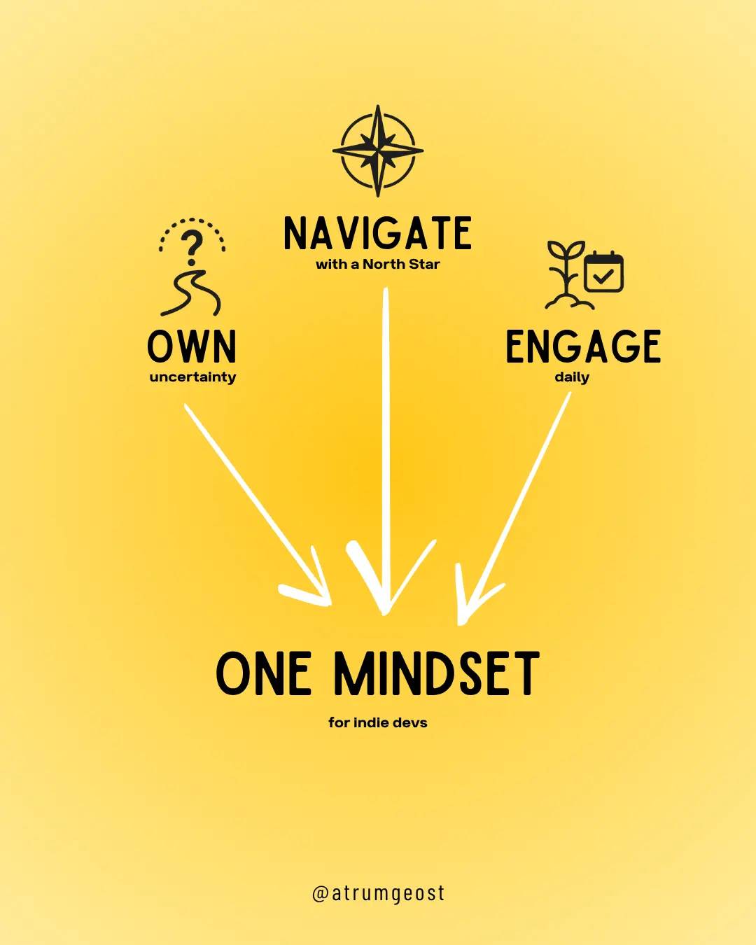 The ONE Mindset for Indie Devs: Own uncertainty. Navigate with a North Star. Engage daily.