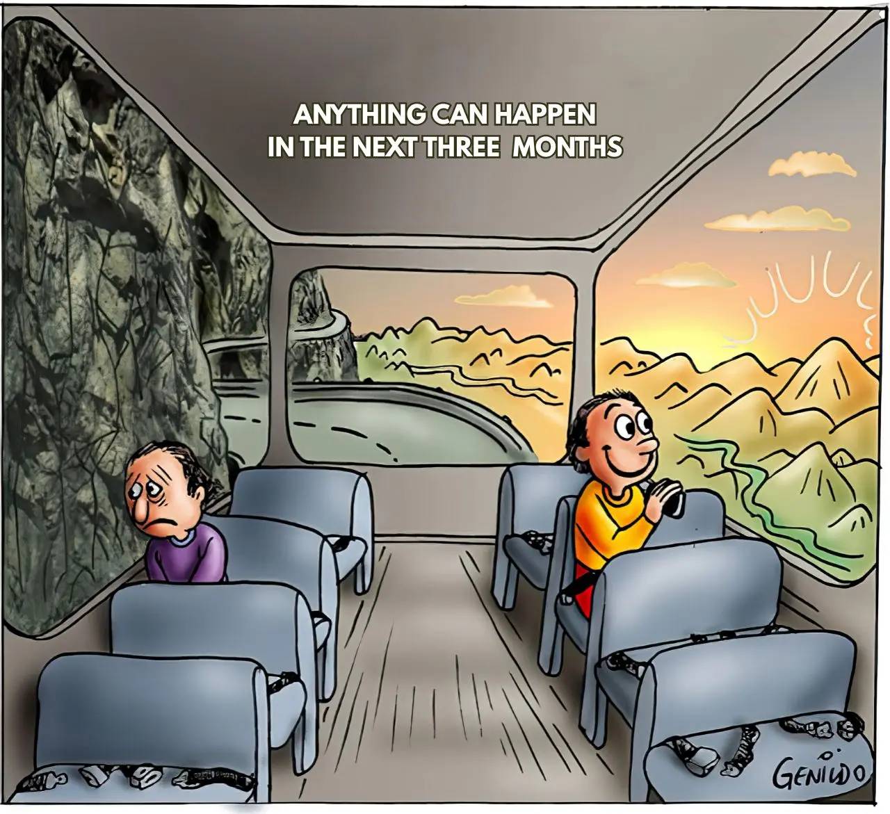 Two people on a bus, one staring at a cliffside, the other at a sunny valley—the same trip, two perspectives.
